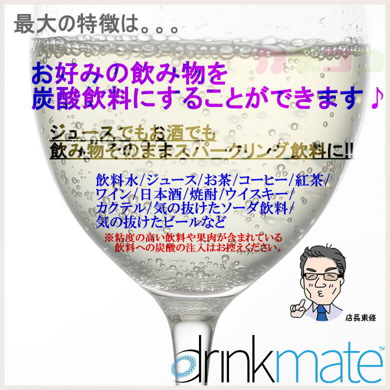 高圧ガス販売事業届 平成25年度 鹿児島県庁消防保安課:消保第32号の11届出済み/販売をする高圧ガスの種類:二酸化炭素(炭酸ガス) シナジートレーディング社 【商品ラインナップ・関連商品】drinkmate DRM1001 ホワイト ドリンクメイト 炭酸飲料メーカー(炭酸水メーカー) ドリンクメイト 炭酸飲料メーカーを動画でご紹介! 実際にドリンクメイトを使ってみました! 最近、大人気の炭酸水!飲料水だけではなく、洗顔や頭皮ケアなどでも 使われている今話題の商品 ”炭酸水” 今ままでの炭酸水メーカーでは、抽出ノズルが本体に固定だった為、衛生上の問題もあり水以外の飲料水に 注入できませんでしたがドリンクメイトがあれば、水はもちろんお好みの飲み物をそのまま炭酸飲料にすることが できちゃいます♪